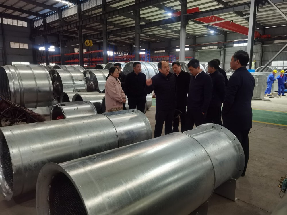 公司总裁刘书鹏(左二)向省经信厅副厅长郭涛(左三)介绍地铁风机